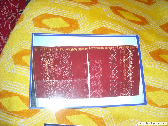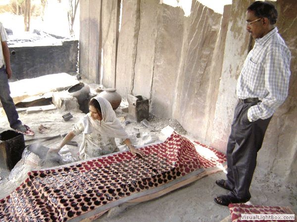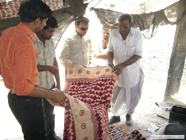Akola is a craft cluster in the Udaipur district of Rajasthan. The Akola region is renowned for hand block printing. The dabu or mud resist printing of this region is of two specific types namely phetia and nangna. These are exclusive to this area. The former is worn primarily by the women of the Jat and Chaudhury castes especially after childbirth or during marriages while the latter were worn by the Gujjar women. The resist is made by a local gum/ bedja and oil and the previously used resist by boiling for several hours. The napthol/alizarinedyed cloth is stamped with the metal blocks. The ash dust is rubbed on the surface to avoid hot resist to stick when folded. Three types of mud resist are used;chuna/lime or kirana is the weakest resist which is used for fine outlines. Mitti/mud is used when the cloth needs to be immersed in indigo a few times and rait/sand, the strongest of resist is used for most absorbent colours like pomegranate and ferrous dyes. A range of products like ghaghra/fabric, odhani-veil cloth, yardage and dupatta-stole.