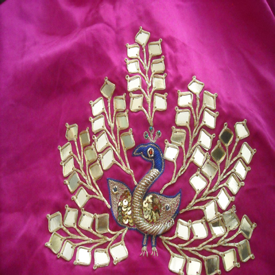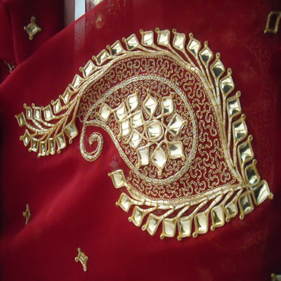 ‘Danke-ka-kaam’ is a kind of metal embroidery in Rajasthan that is a decorative feature in Rajasthani fabrics. It’s a 400-year old embroidery craft in Udaipur, Rajasthan. As of now there are just two practitioners of the craft who does the embroidery. It's a craft that has primarily been practiced by Udaipur's Bohra community. At a workshop held in Udaipur this year, the practitioners was persuaded with great difficulty to train a group of 20 youngsters in the art. When it ended, he proudly reported that at least three had 'tremendous potential' and he would train them further if enough business came his way. The 'danka' is a small square plate, varied in size, but not bigger than 1.5 cm. Though originally it was made of pure gold, now silver-plated with gold dankas are used. To make the danka, thin, well-finished and polished silver sheets of 98 percent purity are electroplated in gold in strips of 30 cm X 2.5 cm. These are washed in water and polished with fine sand. Then the strips are cut into 1.5 cm squares and the squares hammered with a stone implement till they resemble the tip of an ice cream cone.This method was earlier also known as korpatti-ka-kaam. The cost of the Danke ka kaam is calculated according to its weight. This decorative technique is usually worked on fabrics like satin, chiffon or silk fabric. The fabric is stretched tightly on a wooden frame before it is embroidered and the craftsman sits on the floor. Danka pieces are spread on the fabric as required by the design. The danka is pierced with a sharp needle, bringing out the thread through the fabric. About three to five strands of kasab (gold or silver wire) are kept over each danka and couched down along its edges. It is secured with eight stitches in the shape of a knot. Two stitches go into the back and the other two at each corner and two on the front. About three to five strands of 'kasab' (gold or silver wire) are placed over each danka along its edges. It is secured with eight stitches in the shape of a knot - two at the back, one in each corner and two in the front.The most popular motifs used in danka work are inspired by nature - the sun, the moon as well as the paisley design in a stylised form.Round and flat metal braids about one quarter of a centimetre in width that are used to highlight the design. Additional stitches used include the chain stitch, satin stitch for the design filling, while stem and running stitches are for lighter work.