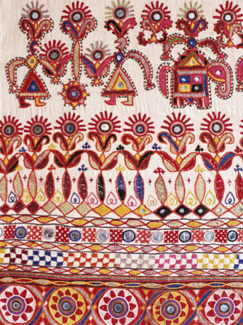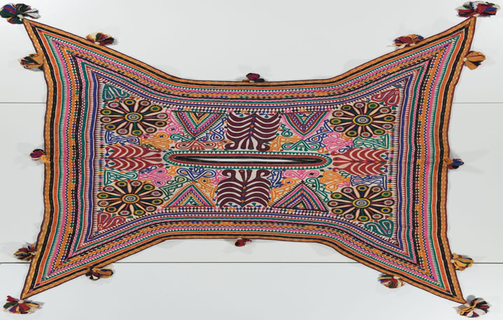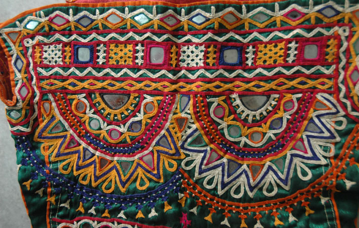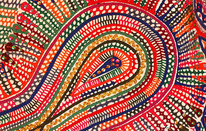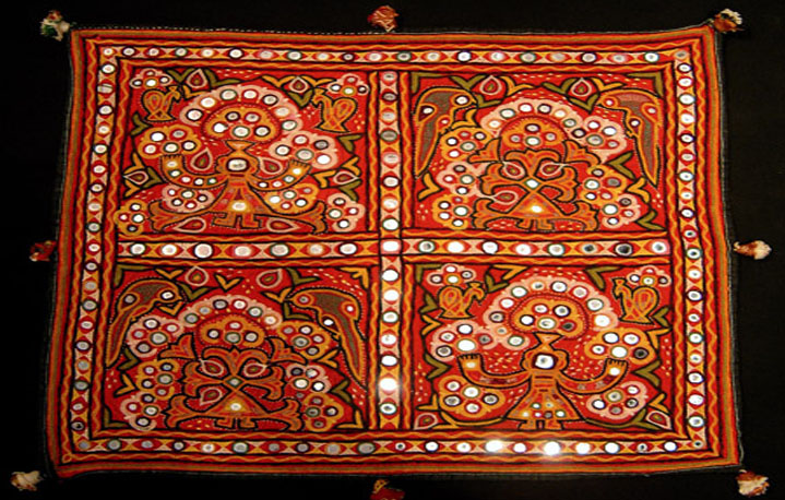 The Rabari Embroidery depicts the creativity of women belonging to the Rabari community in their daily life and lifestyle. The Rabaris are a wandering community known for their extraordinary capacity for survival and adaptation in the arid regions of Gujarat and Rajasthan. They are recognized for their distinctive arts; especially embroidery, beadwork and mirrored mud sculpture. They also traditionally spin the wool from their sheep and give it to local weavers to make the woolen skirts, veils, blankets and turbans Rabaris use.
