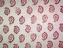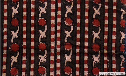 In Gujarat, this form of hand Printing has been practiced and perpetuated by the Paithapur families. They make intricate blocks, and print their textiles using the mud resist-Printing method. These prints are called Sodagiri (trader) prints. In Kutch, the popular patterns are black and red designs of birds, animals, and dancing girls. The saris of Ahmedabad and Baroda have large mango patterns against a red or blue background. The other well known centers for block Printing in Gujarat are Bhavnagar, Vasna, Rajkot, Jamnagar, Jetpur and Porbandar. Dhamadka a village in Gujarat has many printers using mostly madder root for printing red color, rusty iron solution for black color and indigo for blue color. These fabrics are known as Ajrakh. The designs made by block printing are geometric. Many states have block-printing workshops using chemical dyes. However there are only small pockets of areas still using natural dyeing with age-old recipes and local plant material.