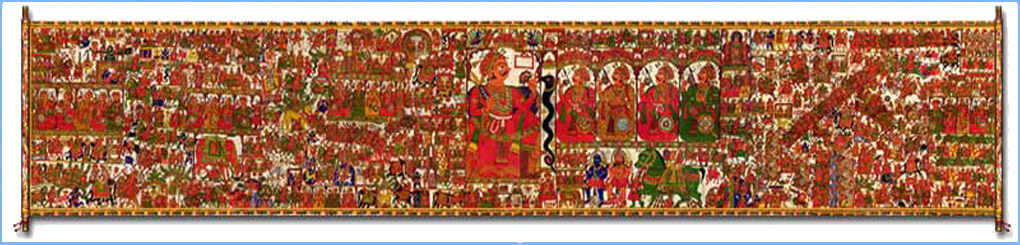 The stories in Phadas sometimes appear to overlap. The central portion depicts the main story while the puranic tales are illustrated on the border areas.
